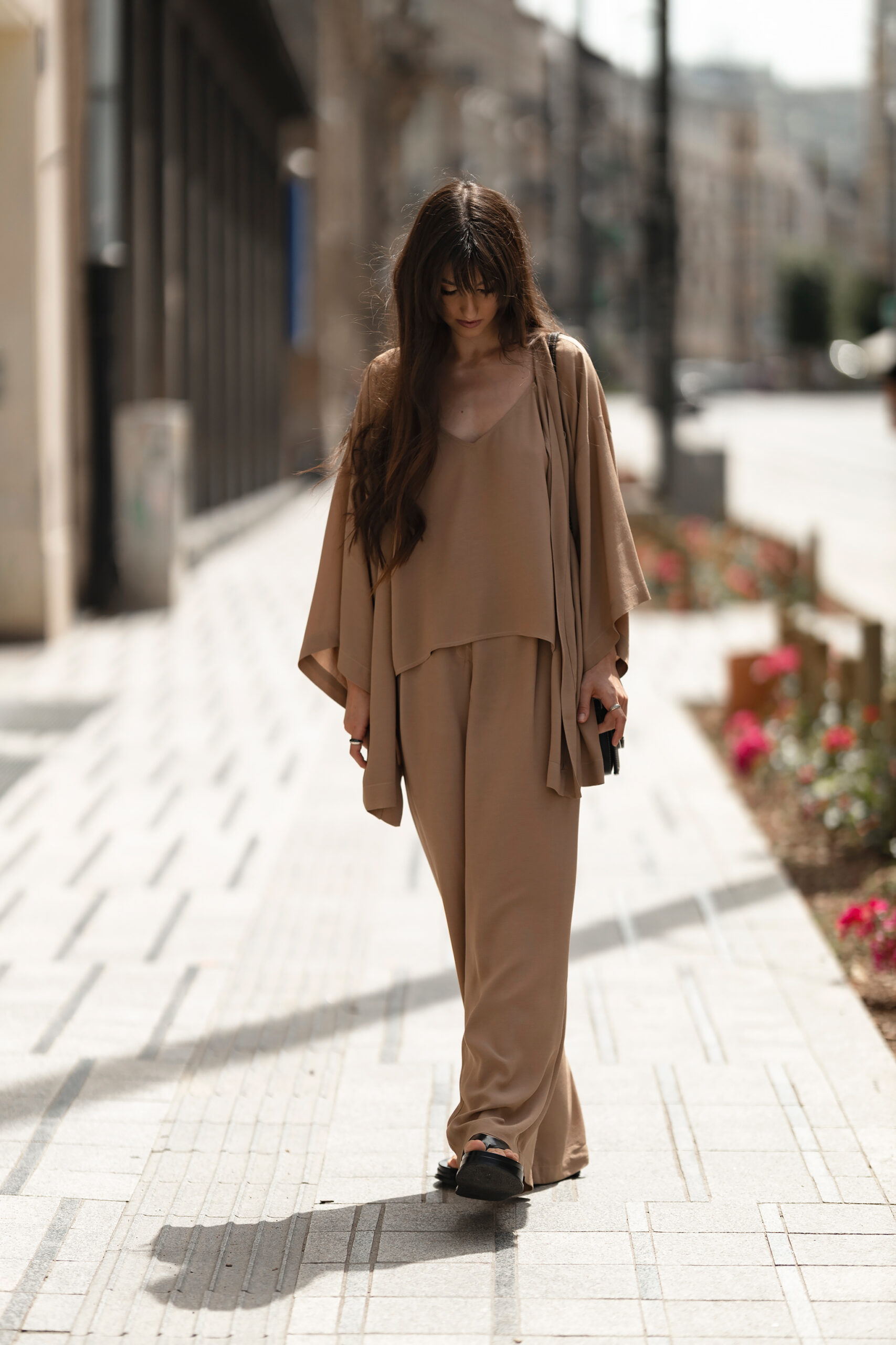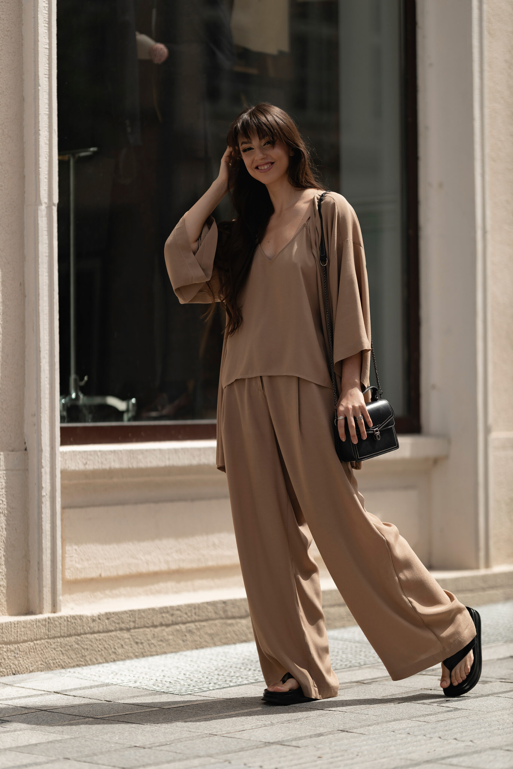 Genialnie połączone, idealnie dobrane, niesamowicie uniwersalne – w taki sposób możemy opisać ten letni zestaw. Składający się z uniwersalnych spodni, kimona przewiązywanego w pasie oraz topu. Wszystko stworzone z ogromną miłością i dbałością o szczegół.