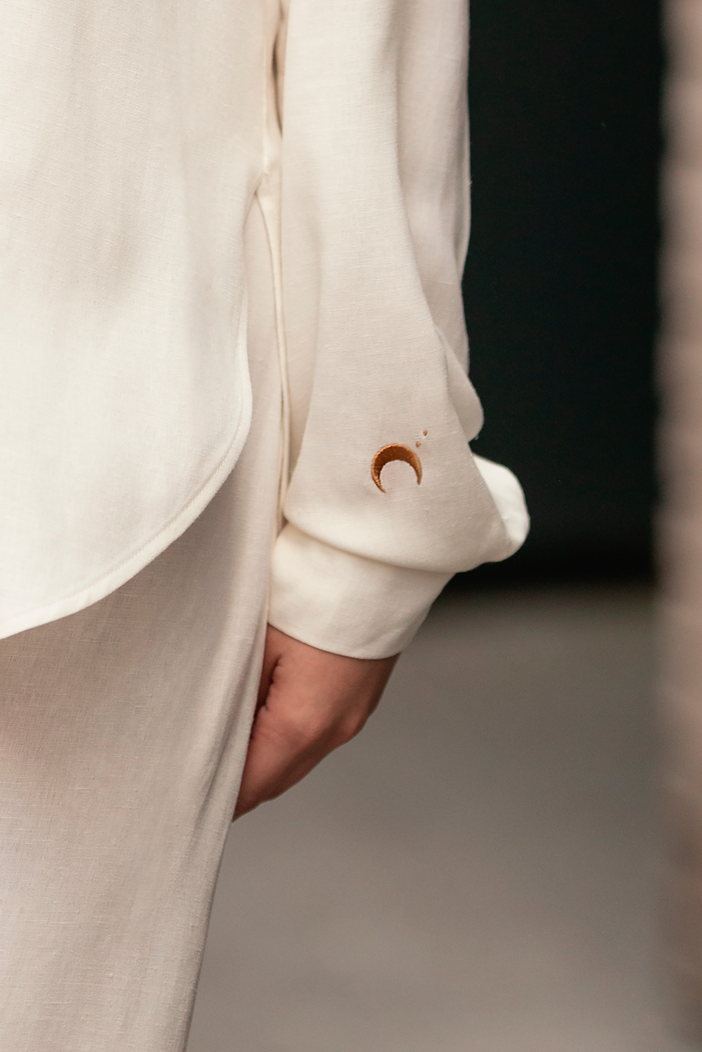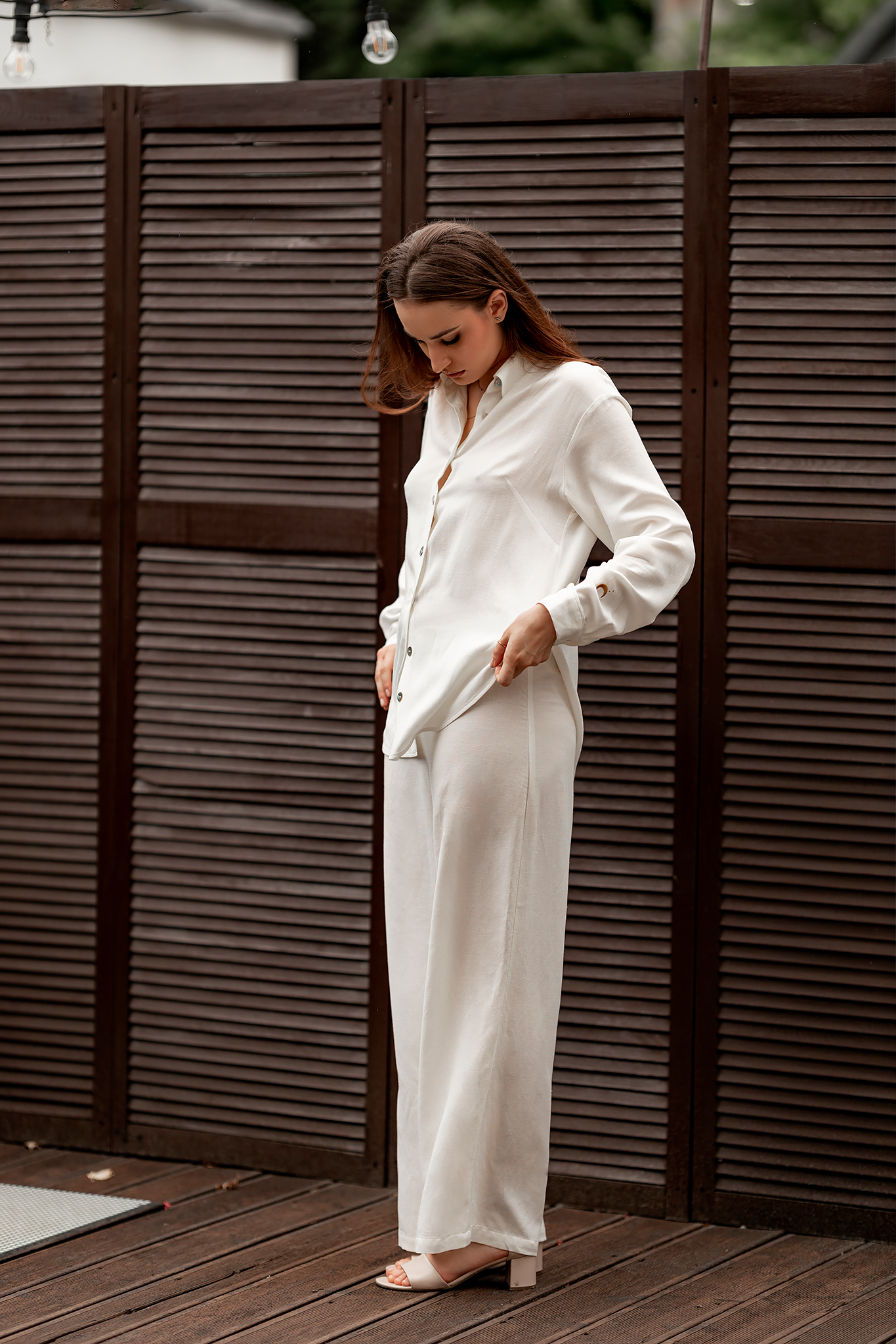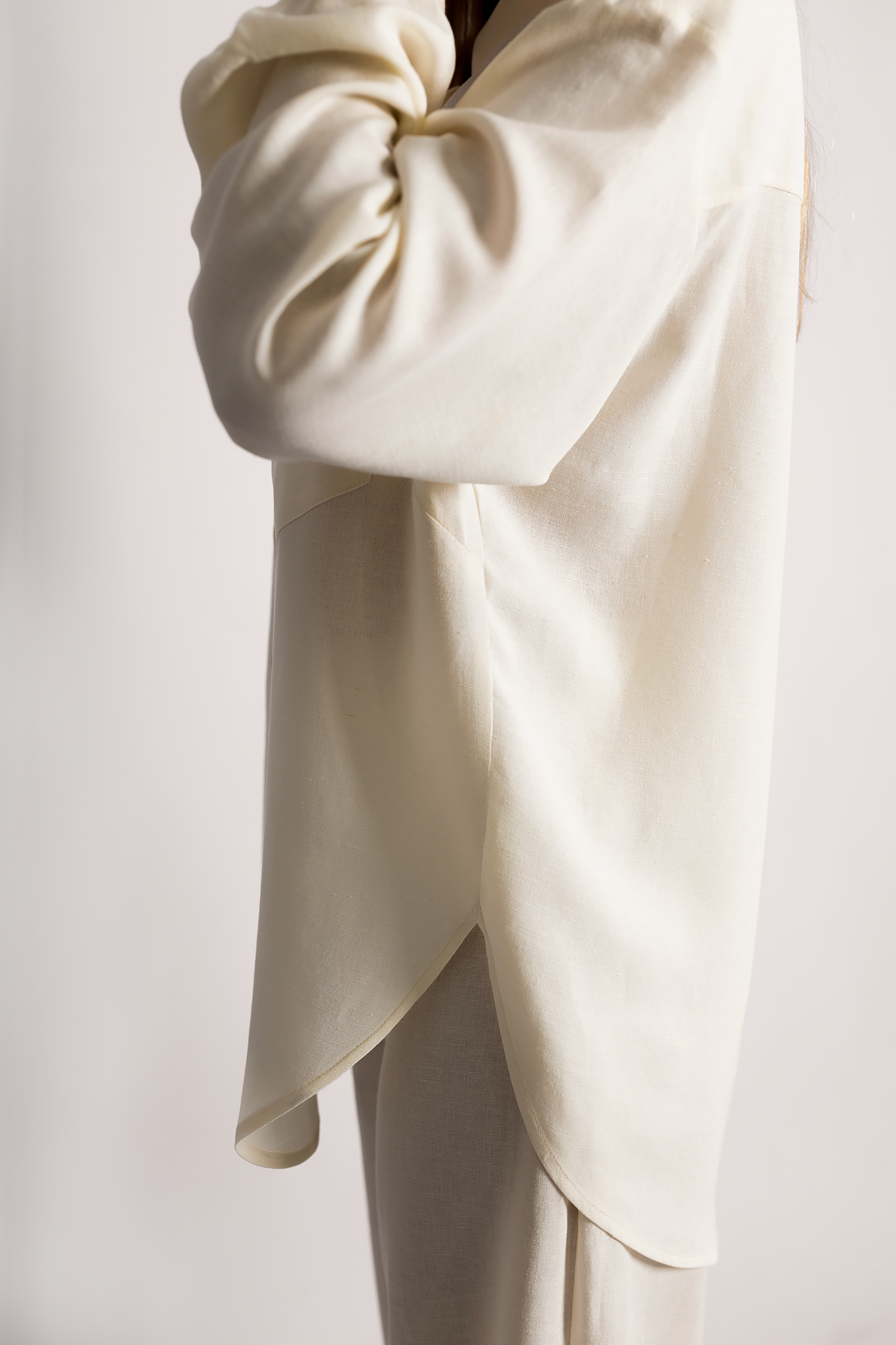 Koszula o delikatnym oversize’owym kroju, przyjemna dla skóry, uszyta z tkaniny o strukturze bardzo zbliżonej do lnu jednak dzięki sporej ilości naturalnej wiskozy bardziej delikatnej. Po bokach ma dość spore wycięcia, dół uszyty z półokręgu, perłowe guziki To wszystko powoduje, że koszula świetnie układa się zarówno  z przodu jak i z tyłu, bez „zakładania” i zawijania tkaniny podczas noszenia.