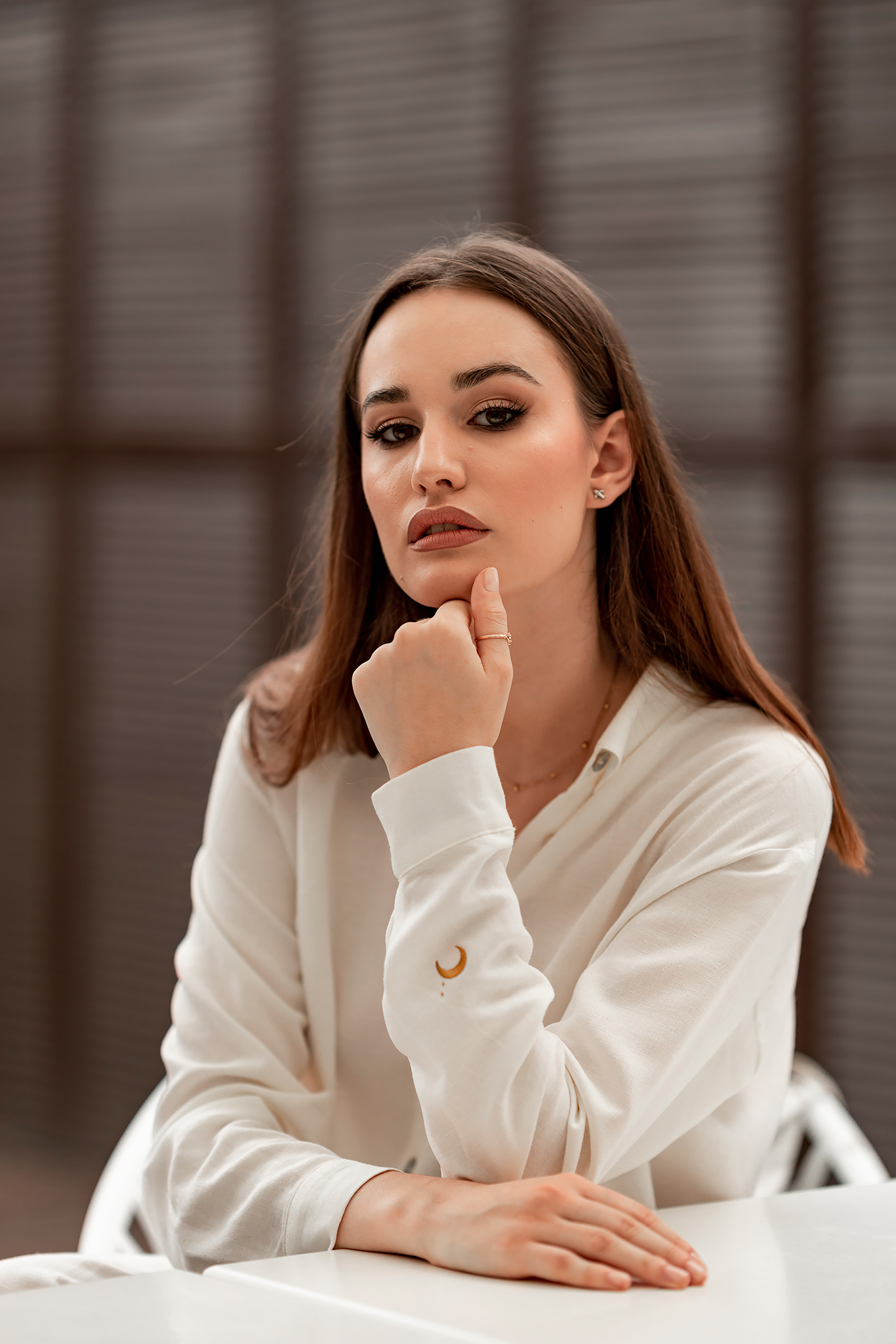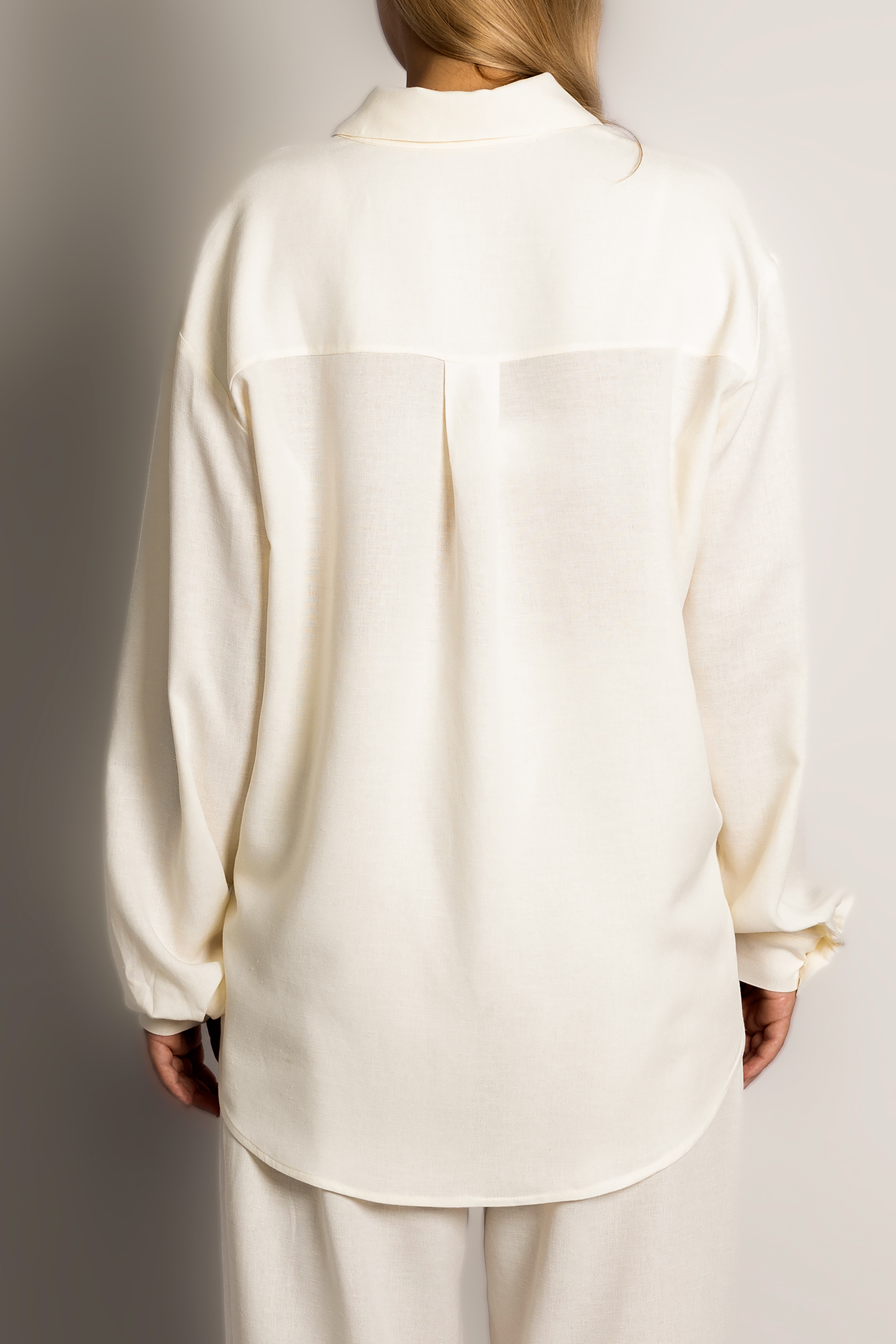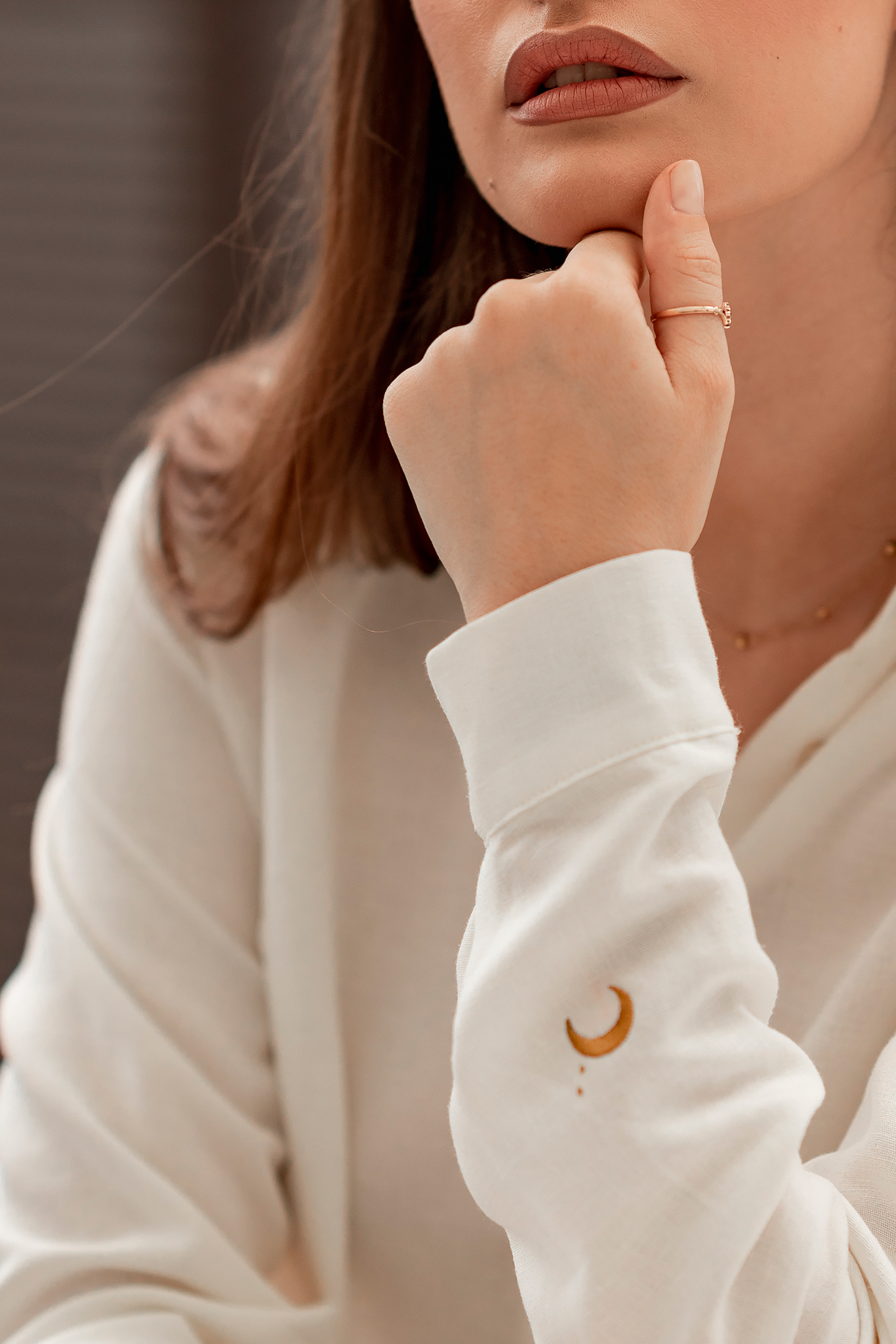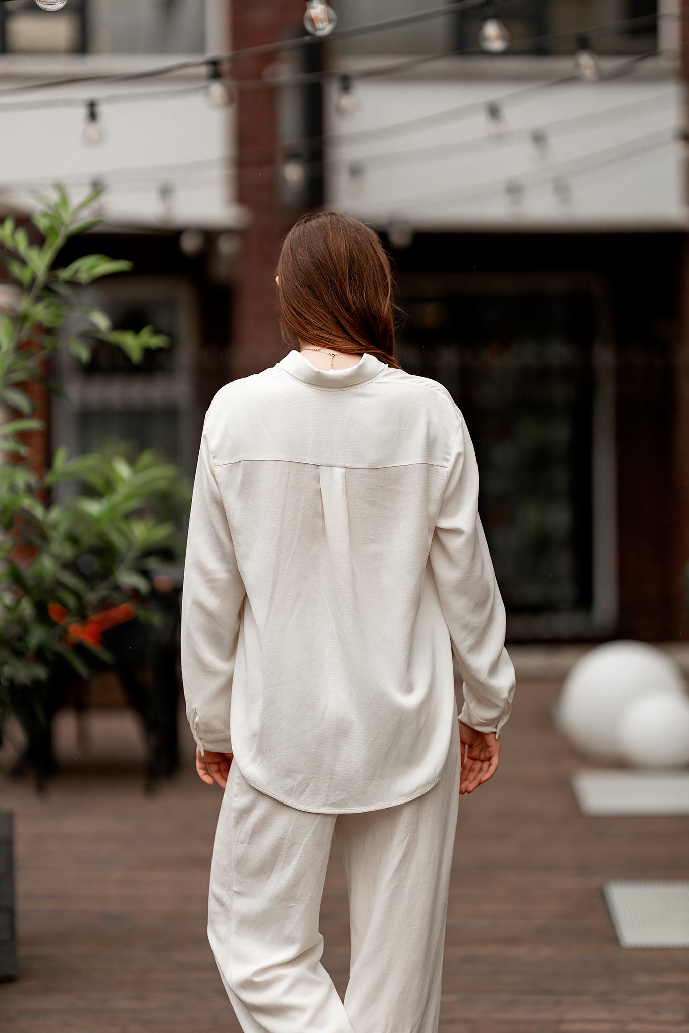 Koszula o delikatnym oversize’owym kroju, przyjemna dla skóry, uszyta z tkaniny o strukturze bardzo zbliżonej do lnu jednak dzięki sporej ilości naturalnej wiskozy bardziej delikatnej. Po bokach ma dość spore wycięcia, dół uszyty z półokręgu, perłowe guziki To wszystko powoduje, że koszula świetnie układa się zarówno  z przodu jak i z tyłu, bez „zakładania” i zawijania tkaniny podczas noszenia.