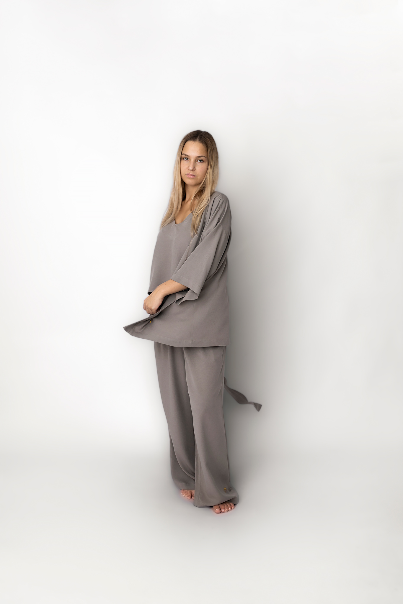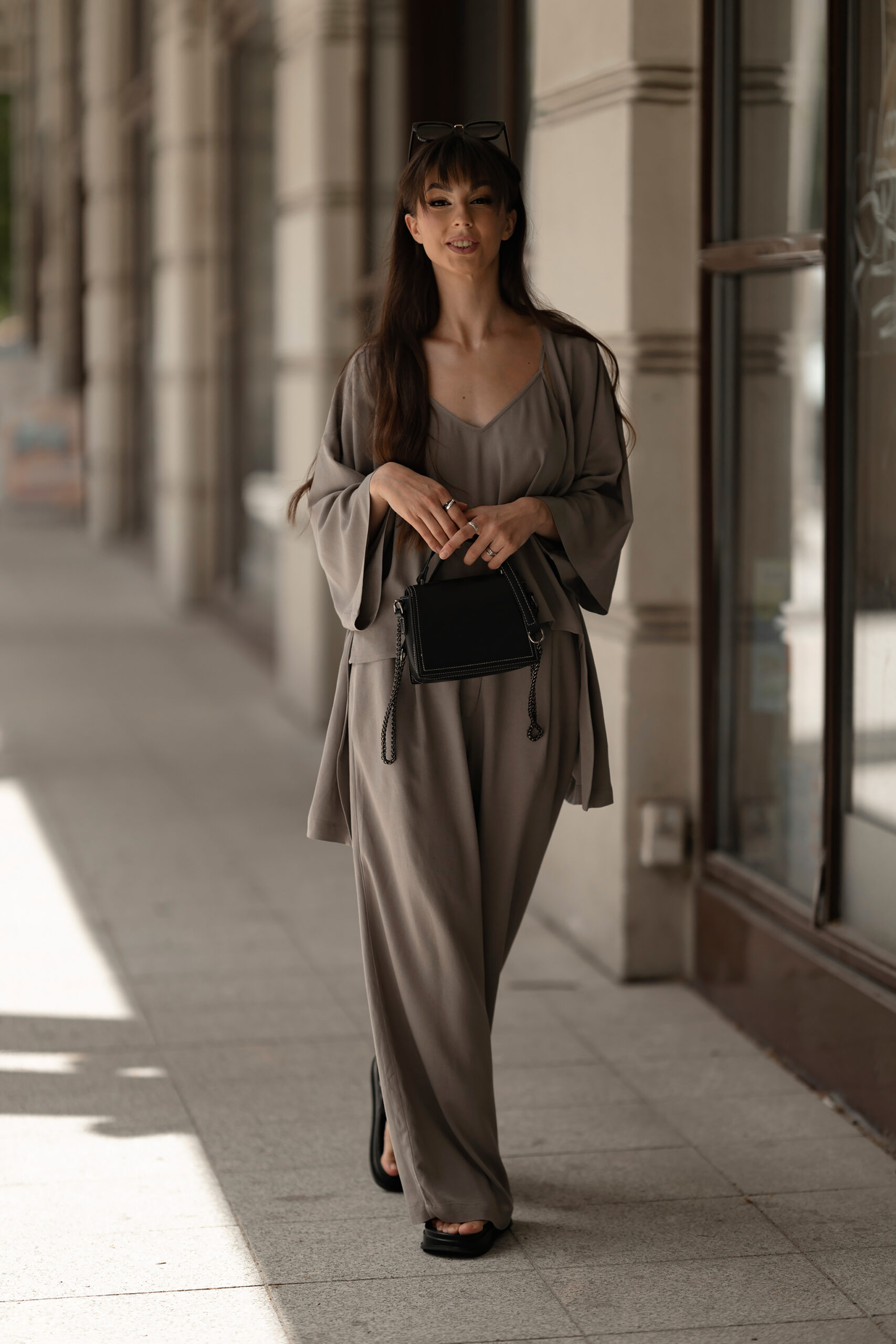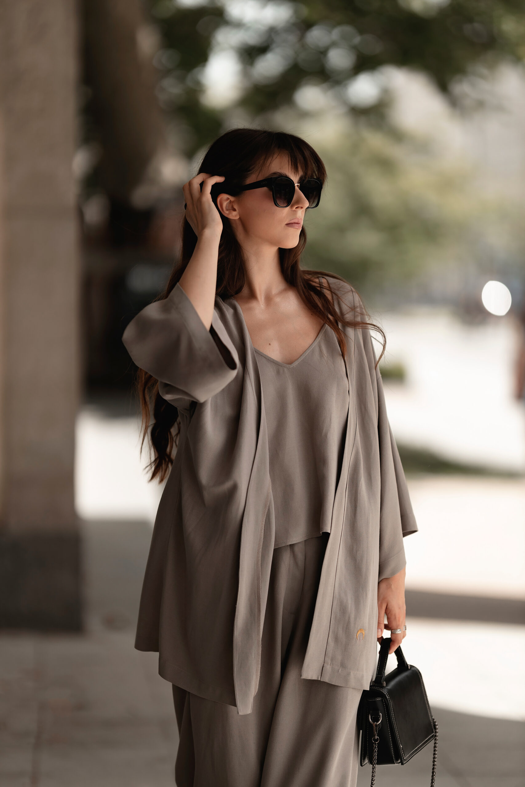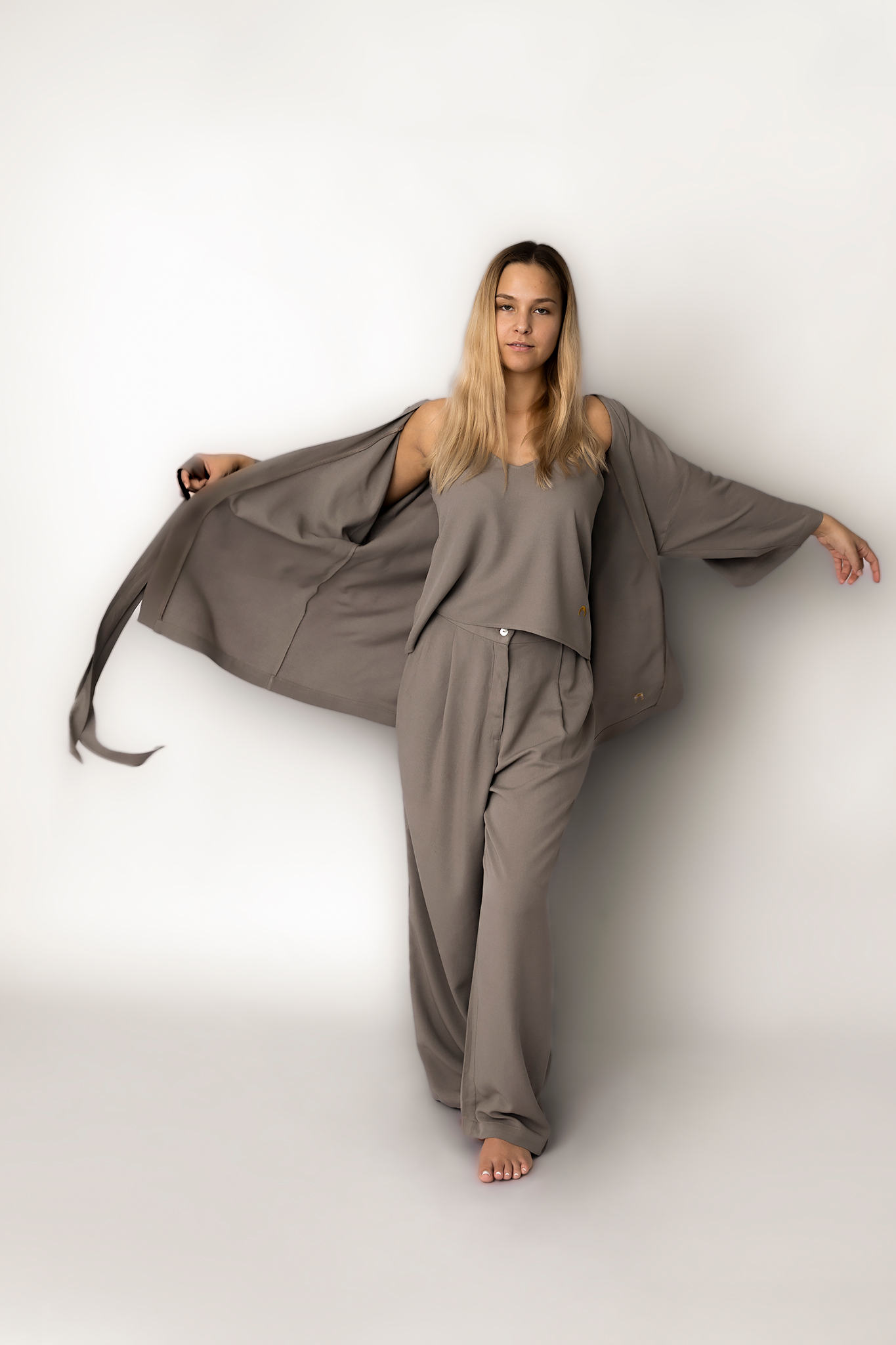 Genialnie połączone, idealnie dobrane, niesamowicie uniwersalne – w taki sposób możemy opisać ten letni zestaw. Składający się z uniwersalnych spodni, kimona przewiązywanego w pasie oraz topu. Wszystko stworzone z ogromną miłością i dbałością o szczegół.